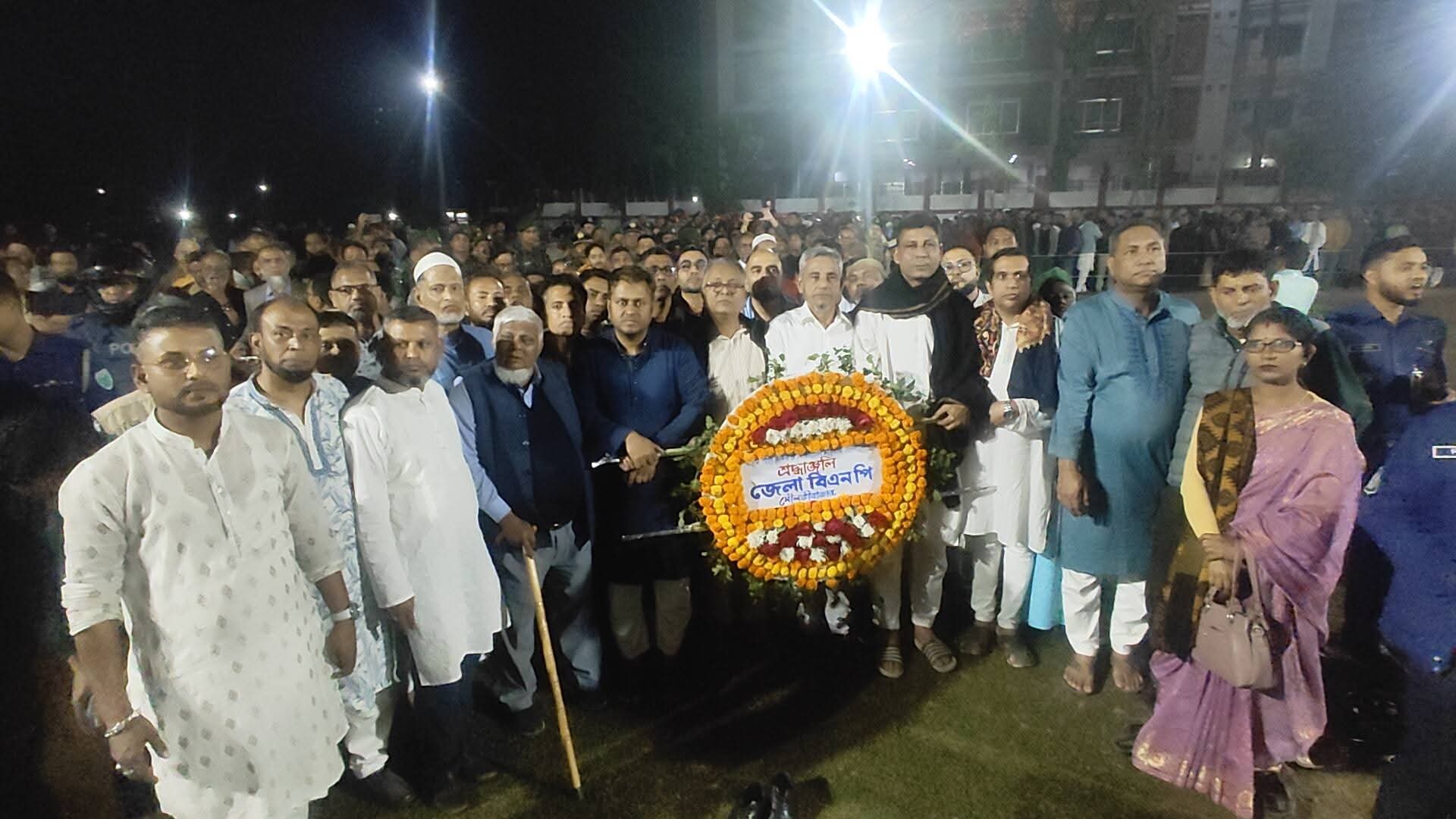 রাত ১২টা ১ মিনিটে একে একে শহরের সরকারি ইচ্চ বিদ্যালয় মাঠ প্রাঙ্গনে স্থানীয় শহীদ মিনারে ফুল দিয়ে শ্রদ্ধা নিবেদন করেন, জেলা প্রশাসক তৌহিদুজ্জামান পাভেল, পুলিশ সুপার মোহাম্মদ বিল্লাল হোসেন, জেলা বিএনপির আহবায়ক ফয়জুল করিম ময়ূন, সদস্য সচিব আব্দুর রহিম রিপন,জেলা বিএনপির সাবেক সাধারণ সম্পাদক মোঃ মিজানুর রহমান মিজান, মৌলভীবাজার জেলা বিএনপি,মৌলভীবাজার প্রেসক্লাব, ফায়র সার্ভিস, আনসার ভিডিপি,ছাত্রদল, যুবদল, কৃষকদল, সড়ক ও জনপথ বিভাগ, এলজিইডি, বিদ্ৎু উন্নয়ন বোর্ড, পানি উন্নয়ন বোর্ড, গণঃপুর্ত বিভাগ, সদর হাসপাতাল, কৃষি সম্প্রসারণ অধিদপ্তর, যুব উন্নয়ন অধিদপ্তর, মৌলভীবাজার অনলাইন প্রেসক্লাব, বিভিন্ন শিক্ষা প্রতিষ্ঠান, সরকারি বেসরকারি প্রতিষ্ঠান সহ বিভিন্ন রাজনৈতিক,সামাজিক,সাংস্কৃতিক ও পেশাজীবি সংগঠন।