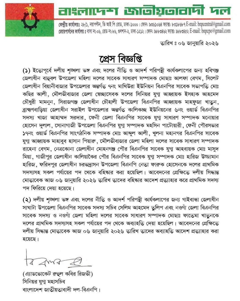 বি এন পির সিনিয়র যুগ্ম মহাসচিব এডভোকেট রুহুল কবির রিজভী স্বাক্ষরিত উক্ত প্রেস বিজ্ঞপ্তিতে উল্লেখ করা হয়েছে,উক্ত বহিষ্কারাদেশ ভুলবশত প্রত্যাহার হয়েছে বিধায় বহিষ্কারাদেশ বহাল থাকবে।ব র্ণিত প্রেস বিজ্ঞপ্তি প্রকাশের পর পরই জেলার বিভিন্ন পর্যায়ের নেতাকর্মীদের মধ্যে বিরুপ প্রতিক্রিয়া দেখা দিয়েছে।