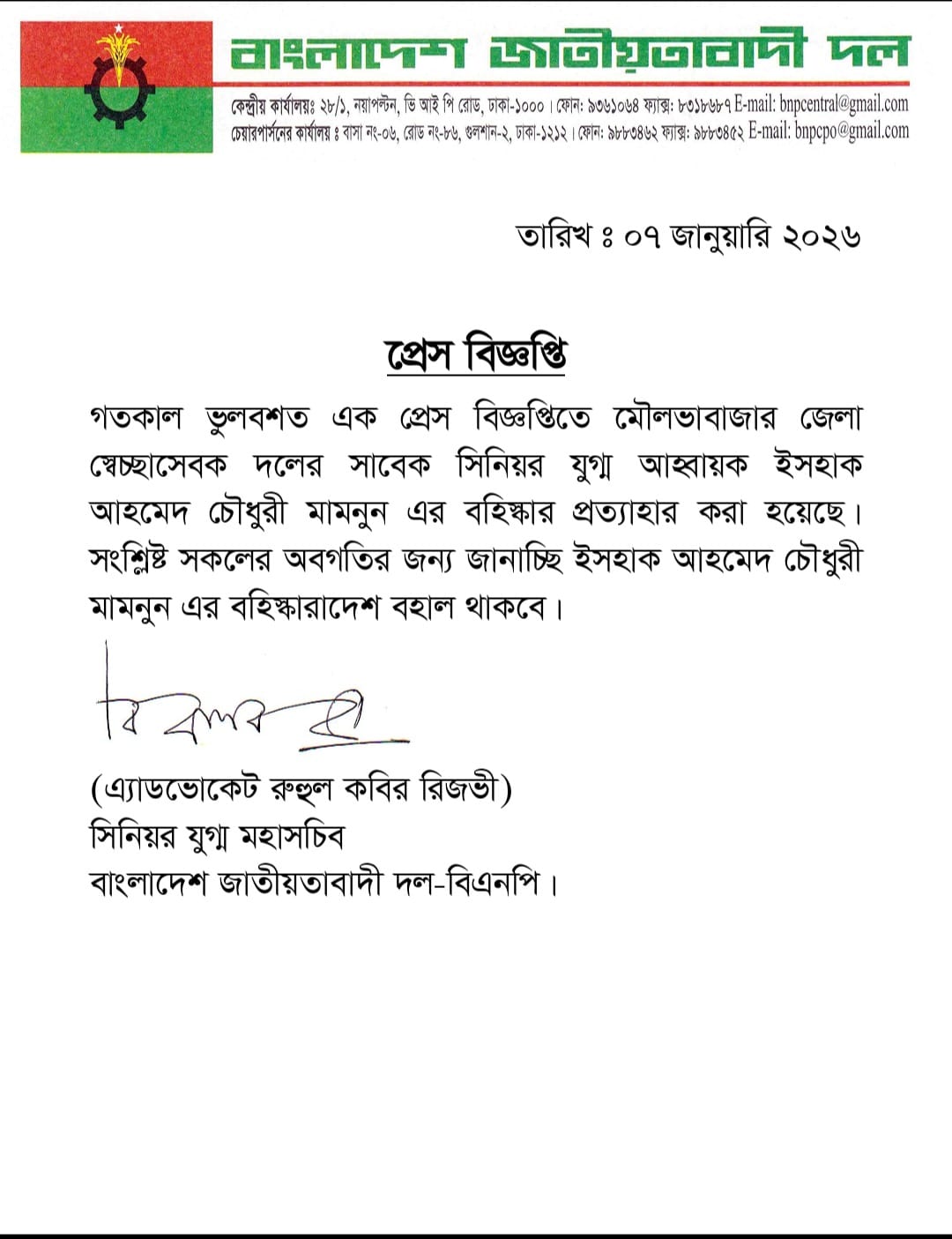 বাংলাদেশ জাতীয়তাবাদী সেচ্ছাসেবক দল মৌলভীবাজার জেলা শাখার সিনিয়র যুগ্ম আহবায়ক ইসহাক আহমেদ চৌধুরী মামনুনসহ সারা দেশের বি এন ও অঙ্গ সহযোগী সংগঠনের ১৩জন নেতাকর্মীর বহিষ্কারাদেশ প্রত্যাহার সংক্রান্ত বি এন পির সিনিয়র যুগ্ম মহাসচিব এডভোকেট রুহুল কবির রিজভী স্বাক্ষরিত প্রেস বিজ্ঞপ্তি গণমাধ্যমে প্রকাশের ২৪ঘন্টার পূর্বেই ভুলবশত মৌলভীবাজার জেলা সেচ্ছাসেবক দলের সিনিয়র যুগ্ম আহবায়ক ইসহাক আহমেদ চৌধুরী মামনুন এর বহিষ্কারাদেশ প্রত্যাহার হয়েছে মর্মে প্রেস বিজ্ঞপ্তি প্রকাশ হয়েছে।