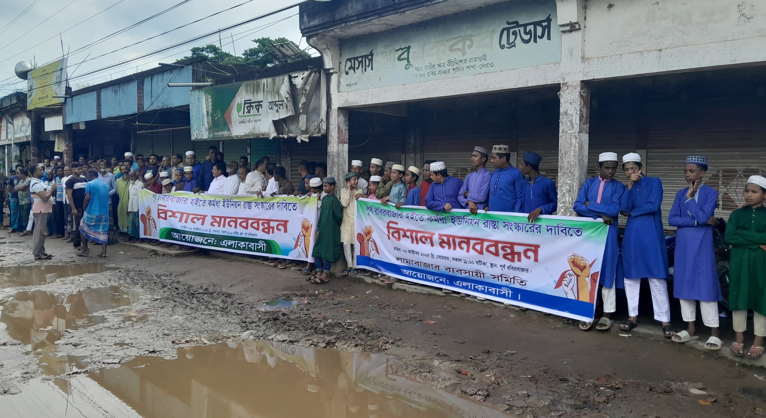 রাস্তাটির সংস্কারের দাবিতে গতকাল সোমবার সকাল ১১ ঘটিকায় মানববন্ধন কর্মসূচি পালন করেন। এতে স্থানীয় স্কুল কলেজ ও মাদ্রাসার শিক্ষার্থী মিলে বিশাল মানুষের সমাগম হয়। মানববন্ধনের সংহতি প্রকাশ করে স্থানীয় জনপ্রতিনিধিরাও।
